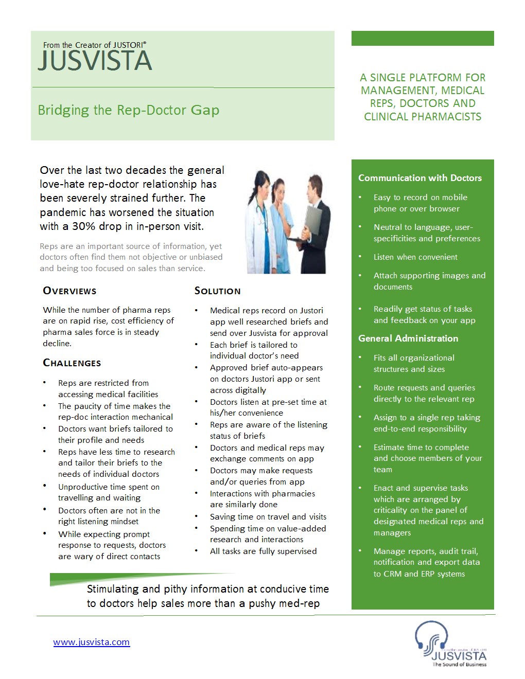 Over the last two decades the general love-hate rep-doctor relationship has been severely strained further. The pandemic has worsened the situation with a 30% drop in in-person visit. During this period with the advent of dime a dozen pharma companies, the competition has become severe and influence peddling all pervasive. From organizing all paid trips to fancy destinations in the name of attending conferences to doling out lavish gifts and treats have become rampant. Indeed, regulators are clamping down. Medical facilities have become out of bound for reps. Principled doctors avoid reps like the “Covid”. PLOS Journal, an open access publisher, concluded in an article on how reps make friends and influence doctors, “... every word, every courtesy, every gift, and every piece of information provided is carefully crafted, not to assist doctors or patients, but to increase market share for targeted drugs. In the interests of patients, doctors must reject the false friendship provided by reps.” Still timely and easily consumable information about drugs is an absolute necessity for doctors. The ill-effect of influence peddling is thus not limited to rep-doc dynamics, it takes toll on the entire eco-system of healthcare. It is time to bridge the gap and reestablish the trusted relationship between doctors and drug reps, a sine qua non for the well-being of patients and a properly functioning healthcare system.